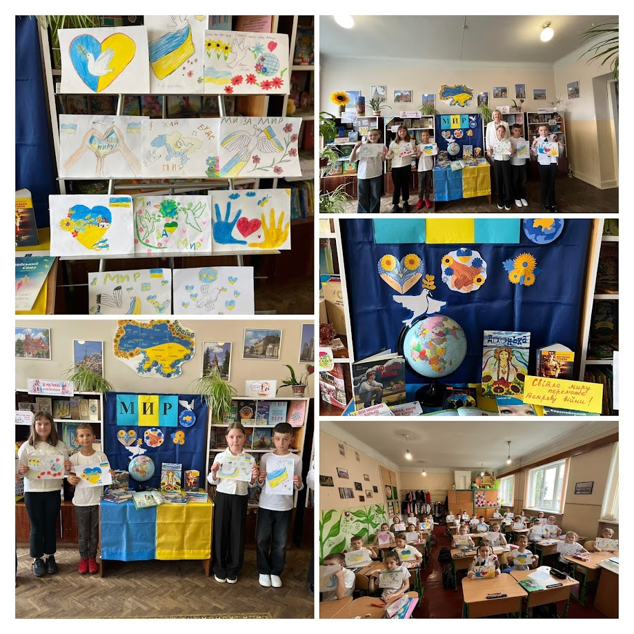 У 4 – Б класі (кл. Лозовик О.М.) з нагоди свята малювали малюнки про мир. На аркушах паперу ожили сонце й небо без вибухів, білі голуби, квітуча Україна. Після цього малюнки передано до шкільної бібліотеки, де оформлено яскраву виставку.