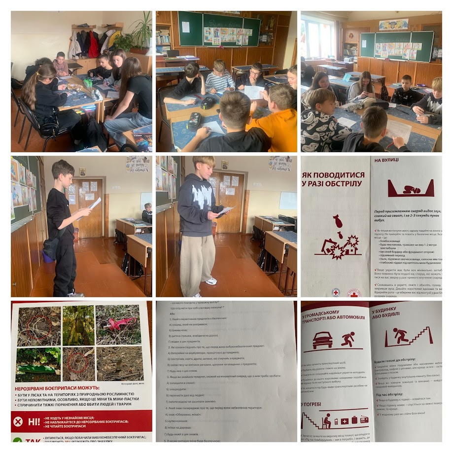 Один з етапів уроку був присвячений безпеці життєдіяльності під час війни. Учні працювали в групах, вивчаючи інструкцію як поводитися під час обстрілу, прослухали розповідь вчителя Увага ! Небезпека ! Заключний етап уроку провели бліц-опитування “мінна небезпека”.