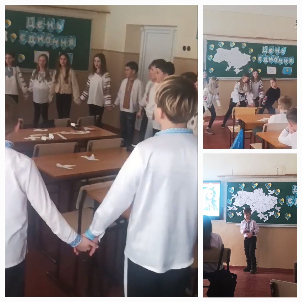 у 5-Б класі, з метою виховання любові до батьківщини, розвитку почуття патріотизму та відповідальності за майбутнє країни. Нехай сьогоднішній день нагадає кожному з нас: разом ми — велика сила, разом ми — народ, разом ми — Україна. І саме в цій єдності — наша надія, наша міць і наша обов’язкова Перемога. Діти складали пазл карти України, створювали коло єдності, записували побажання і слова вдячності на символічних голубах