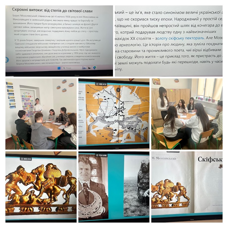 27 лютого учні історичного гуртка КЛІО разом з вчителем історії Грабовською Н. З. провели Урок-дослідження «Борис Мозолевський – відкривач скіфських скарбів»